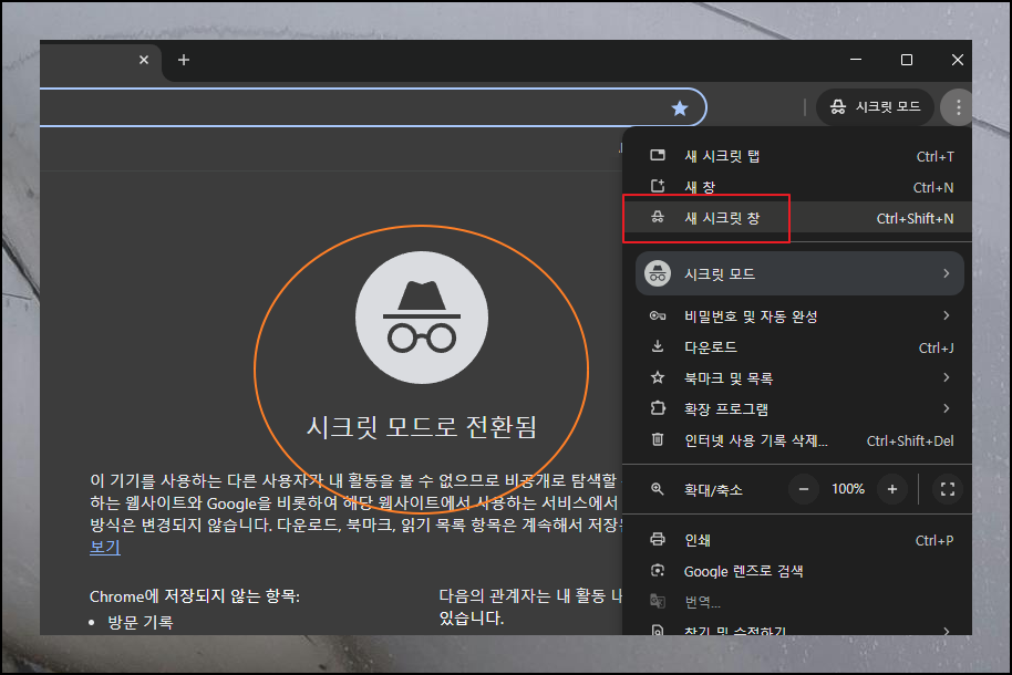 일단 비행기표 관련 사이트를 이용하기에 앞서 브라우저를 시크릿모드로 전환해 줍니다. 제가 크롬을 사용하고 있기 때문에 크롬을 기준으로 시크릿모드를 실행하는 방법을 안내해드리겠습니다. 브라우저를 열고 화면에서 우측 상단에 있는 점 3개 버튼을 누르면 여러 가지 메뉴가 등장합니다. 여기에서 [새 시크릿 창] 옵션을 선택하거나 단축키(Ctrl+Shift+N)를 누르면 됩니다.