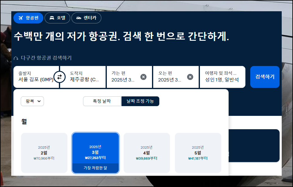 사람마다 비행기를 타고 방문하려는 곳이 다르죠. 이에 따라 출발지, 도착지, 가는날, 오는날, 좌석 등급 및 승객 정보를 본인의 상황에 맞게 정확하게 입력해 줍니다. 일정을 조정할 수 있는 분은 날짜 선택에 있어서 [한 달 전체]를 고르시면 좋아요. 저는 2025년 3월을 선택했는데, 이렇게 하면 3월 중 항공권을 가장 저렴하게 구매할 수 있는 날짜를 파악할 수 있습니다.