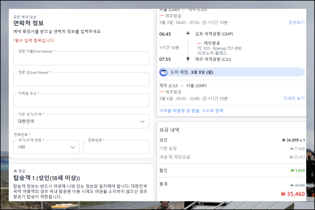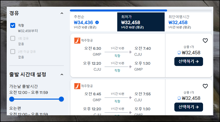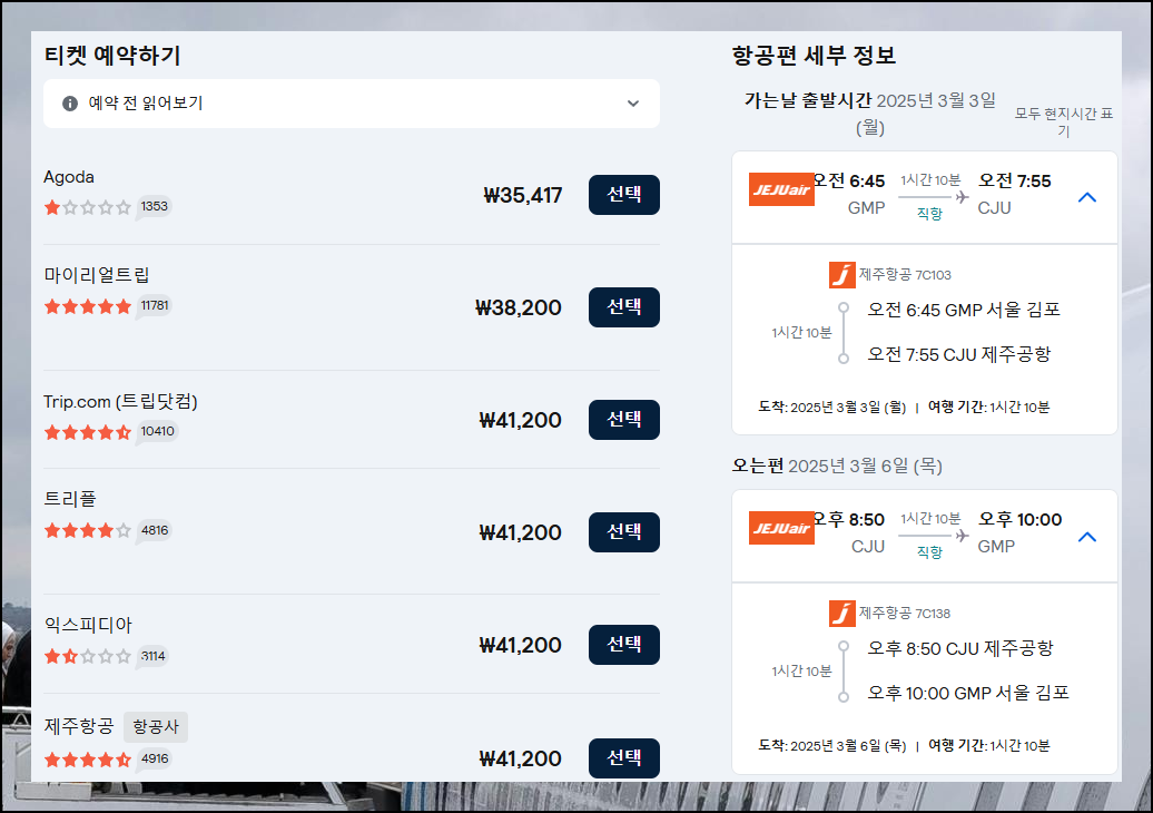 제가 평소에 활용하던 방식으로 제주행 비행기표를 찾아보았습니다. 왕복으로 35,460원이고, 여기에는 항공운임, 유류할증료, 제세공과금, 발권수수료가 모두 포함되어 있습니다. 이와 같이 여러 티켓에 대한 가격비교를 통해 최적의 선택을 할 수 있는데요. 여기에서 [예약하기] 버튼을 클릭하기만 하면 온라인으로 바로 티켓 예매를 진행할 수 있죠.