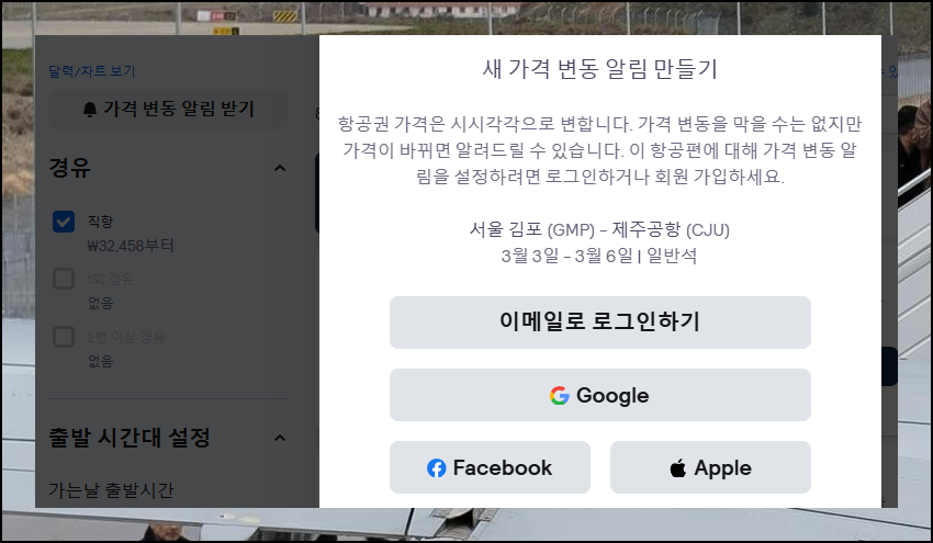 이러한 특가가 발생했을 때 알림을 받을 수 있도록 지원하는 기능입니다. 알림을 수신하면 바로 해당 비행기표 가격비교 서비스에 방문하여 예약을 진행하면 됩니다.