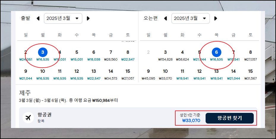 [검색] 버튼을 누르면 웹사이트에 달력 모양의 요금표가 표시됩니다. 각 날짜별로 가장 경제적으로 구매할 수 있는 비행기표의 가격을 확인할 수 있는데요. 이렇게 날짜별 요금비교를 통해 비행기 탑승 일자를 결정해보세요. 저는 3일과 6일을 선택했는데요. 최저가 제주 항공권의 금액이 33,070원 정도라고 나오네요.