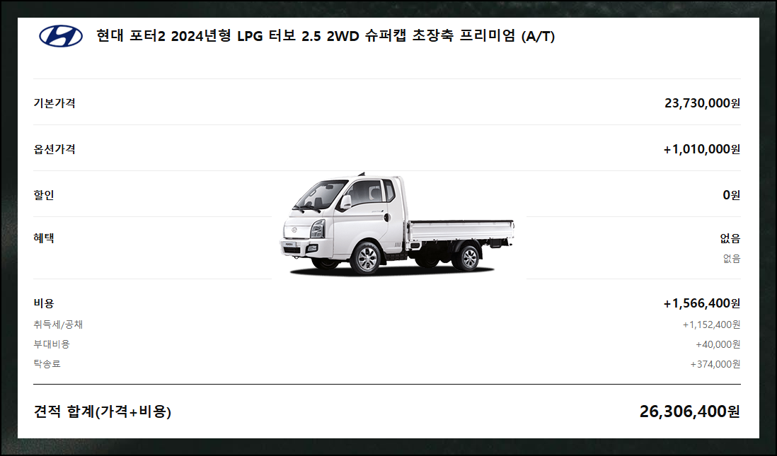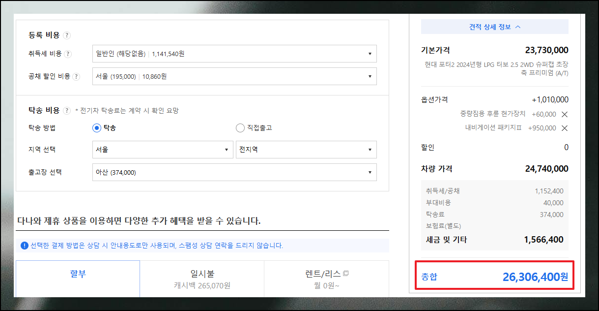 포터2는 1톤 트럭 부분에 있어서 최고 인기 모델입니다. 현대자동차를 구입할 때는 기본 가격 외에도 취득세, 공채비용, 부대비용, 탁송료까지 홈페이지에서 한번에 파악할 수 있어요. 원하는 옵션을 추가하면 그에 따른 비용도 자동 산출되어 이렇게 정확한 금액 확인이 가능합니다.