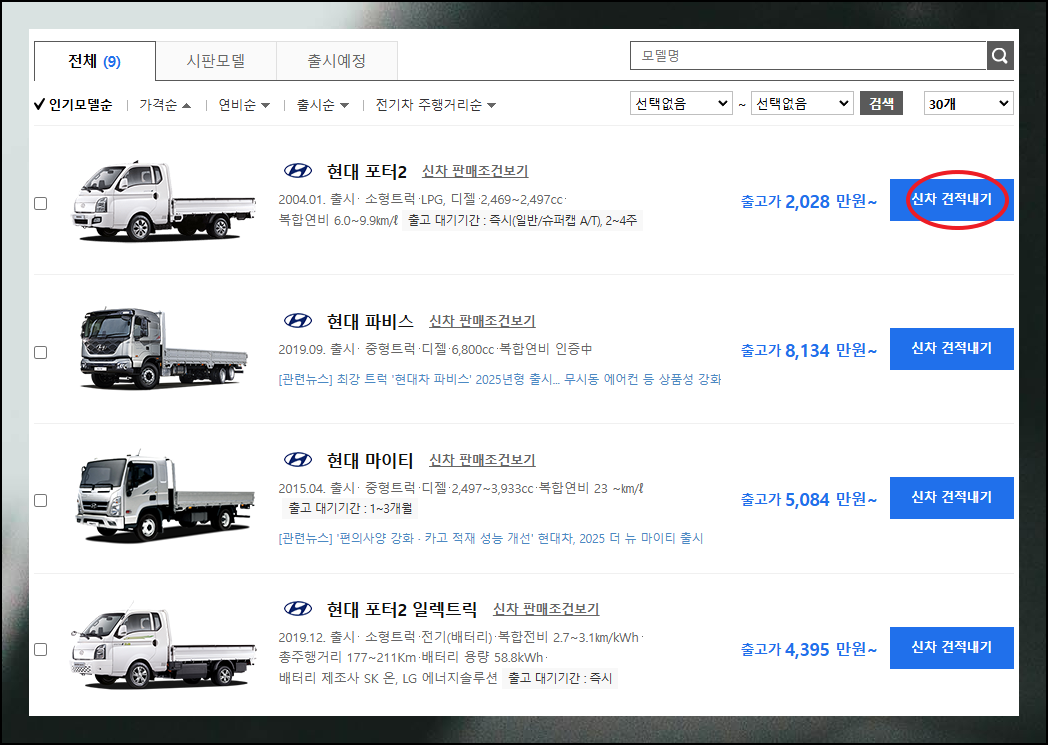 인기순으로 현대 상용차 모델이 홈페이지에 표시됩니다. 이곳에서는 금액이 범위로 나타나는데, 정확한 시세를 알아보려면 관심 있는 차량명을 클릭해 더 자세한 내용을 살펴보세요.