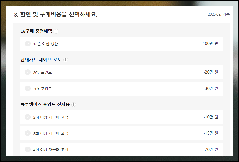 신차 판매조건 중 본인에게 해당하는 항목을 선택합니다. 이 선택은 최종 견적에 자동으로 반영되므로 꼼꼼히 체크하는 것이 중요해요. 시세에 큰 영향을 미칠 수 있는 요소입니다.