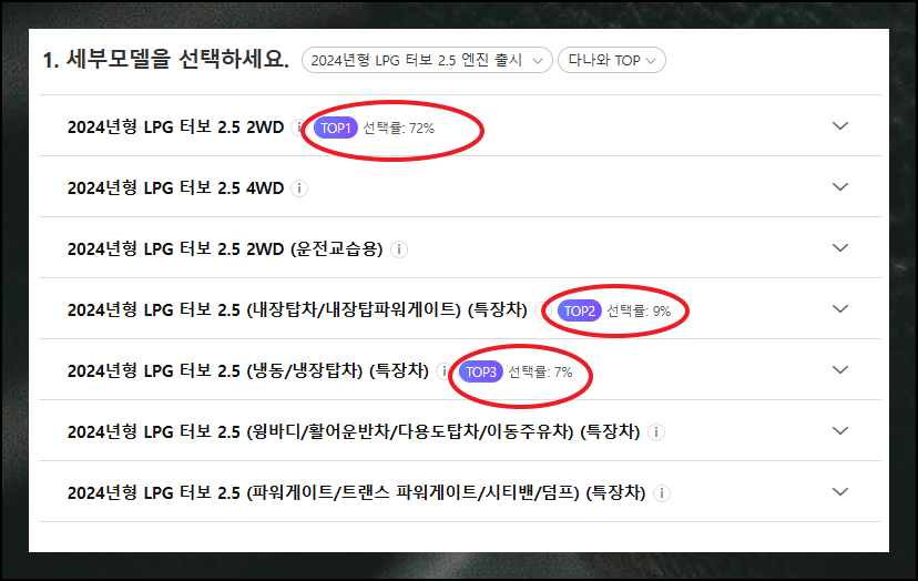 이제 옵션과 색상을 고를 차례입니다. 구매 후 변경이 어려운 부분이므로 신중하게 결정해야 해요. 세부사항에 대해 더 알고 싶다면 현대 홈페이지의 가격 옆 화살표를 눌러 상세 정보와 이미지를 확인하세요.