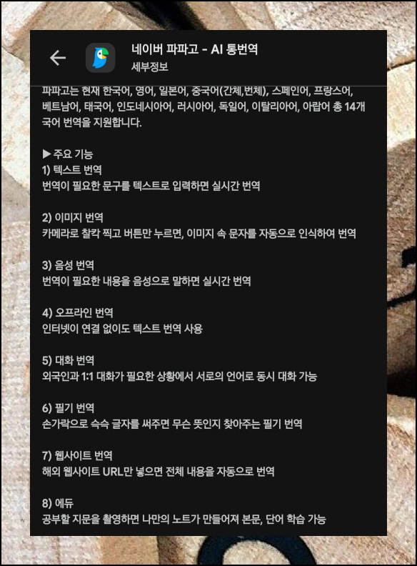 네이버의 "파파고" 어플을 구글 플레이 스토어에서 검색해보세요. 번역은 물론이고, 비용 부담 없이 이용 가능한 기본회화 서비스를 제공하며 품질이 매우 뛰어납니다. 여행 중 언어 소통에 어려움을 겪는 분들께 완벽한 동반자가 될 수 있어요. 해외 방문 시 꼭 필요한 영어 소통 도구입니다.