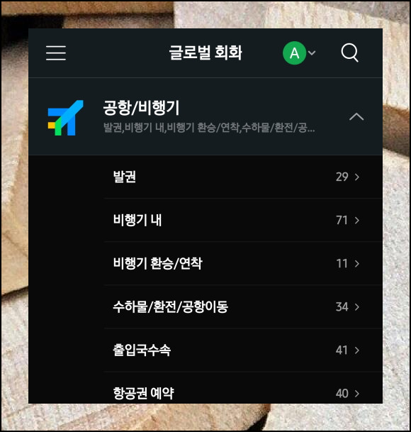 이제 실제 여행 상황별 기본회화를 살펴볼 차례입니다. 공항/비행기, 숙박, 레스토랑, 쇼핑, 교통, 관광, 통화 등 다양한 카테고리로 구분되어 있어요. 해외 방문 중 필요한 상황을 터치하면 관련 표현들을 바로 확인할 수 있습니다.