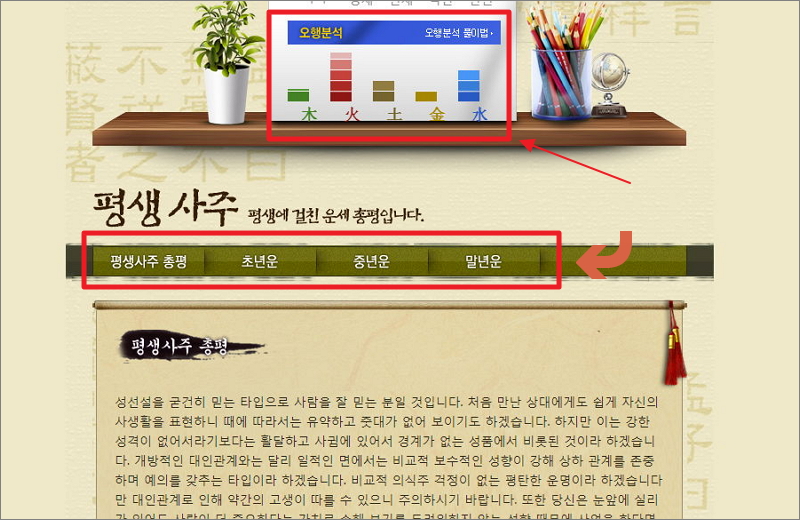 ▼ 사람마다 사주에 따른 오행을 갖고 있습니다. 목, 화, 토, 금, 수 이렇게 5가지 중에서 어떤 것은 많이 가지고 있고, 또 다른 것은 적게 가지고 있습니다. 사주 도우미 서비스의 상세한 풀이를 읽어보기 전에 오행에 대해 알아보는 것이 좋습니다. 풀이법을 제공하고 있기 때문에 이해하는 데에 도움이 됩니다. 오행 다음으로 만나볼 수 있는 사주풀이 결과는 평생에 걸친 운세 총평입니다. 이와 더불어 초년, 중년, 말년에 들어오는 운입니다.