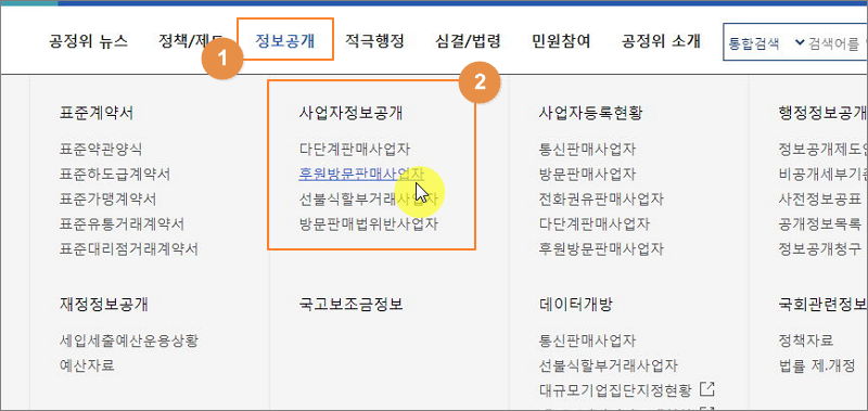 ▼ 규모가 크지 않은 경우에는 다른 방법을 통해 업종조회를 해볼 수 있습니다. 통신판매, 방문판매, 전화권유판매, 다단계판매, 후원방문판매를 하는 사업자의 경우 공정거래위원회 사이트를 통해 관련 사업자등록번호 외 여러 가지 정보를 알아볼 수 있습니다.