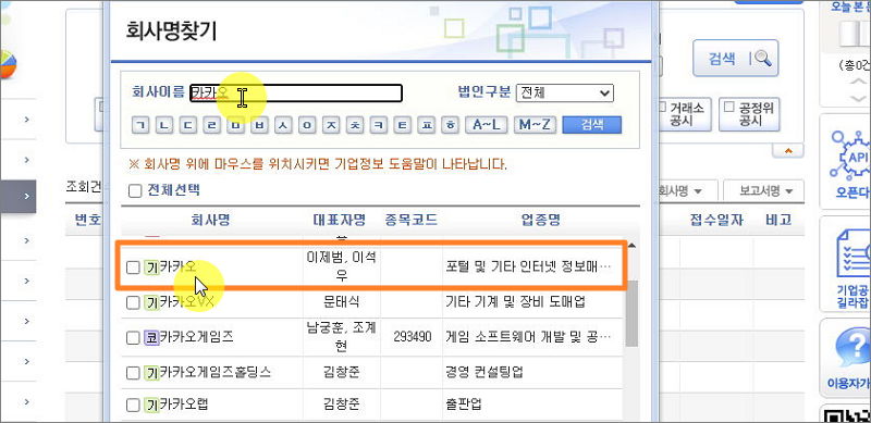▼ 사업자등록번호나 업종을 알아보고 싶은 회사의 이름을 입력한 후 검색 버튼을 클릭합니다. IT 기업으로 유명한 카카오를 검색해 보았습니다. 해당 키워드이 회사명에 포함된 회사가 여러 곳 나타났습니다. 검색 결과 만으로도 업종조회를 쉽게 할 수 있습니다. 여기서 더 자세한 정보를 얻고 싶다면 회사명을 마우스로 클릭하면 됩니다.