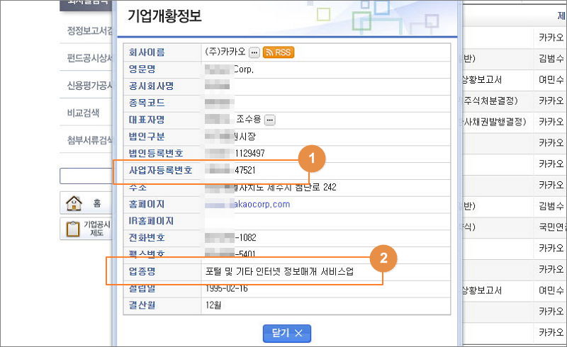 ▼ 기업개활정보가 입력된 창이 나타났습니다. 여기에는 영문으로 된 회사이름, 공시회사명, 종목코드, 대표자명, 법인등록번호, 사업자등록번호, 주소, 전화번호, 업종 등 여러 가지 정보에 대한 조회가 가능합니다.