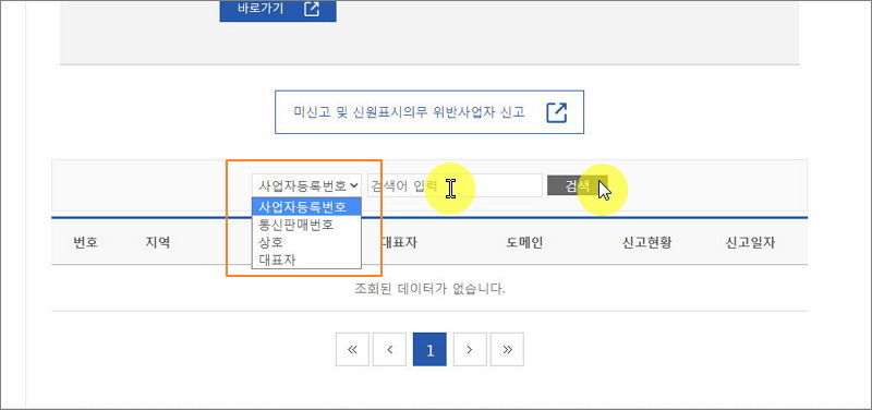 ▼ 알고 있는 사업자등록번호를 입력해 보았습니다. 해당 사업자의 지역, 상호, 대표자 이름, 신고현황 정보, 신고일자를 확인할 수 있었습니다.