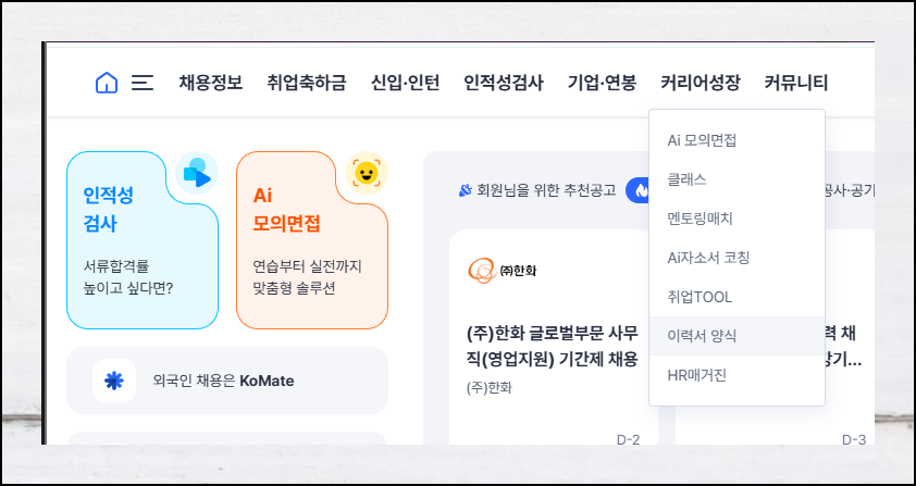 플랫폼에 접속하면 여러 채용 공고가 나타납니다. 기본이력서 양식을 찾기 위해 메인화면의 [커리어성장]과 [이력서 서식]을 차례로 클릭해주세요. 요즘엔 AI가 자기소개서 작성을 코칭해주는 서비스도 있네요. 이런 기능도 나름 취업 준비에 도움이 될 것으로 생각이 됩니다.
