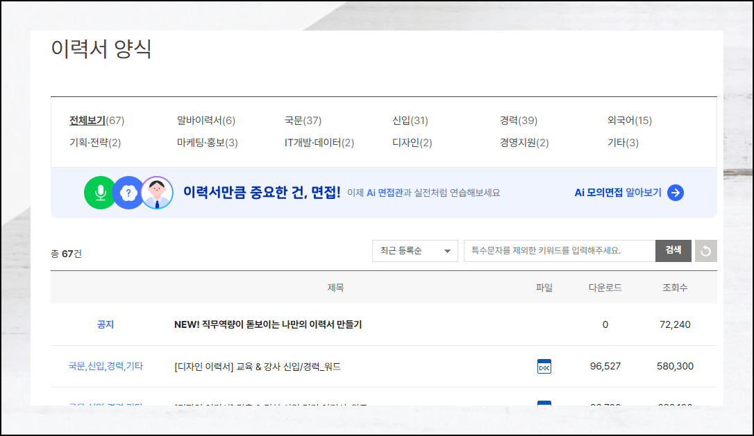 "이력서 양식" 페이지에서는 여러 종류의 템플릿을 무료로 내려받을 수 있어요. 아르바이트용, 외국어 특기 강조용, 경영지원부서 전용 등 목적에 맞는 자료가 마련되어 있답니다. 자신의 상황과 지원하려는 직무에 적합한 기본이력서를 골라보세요.