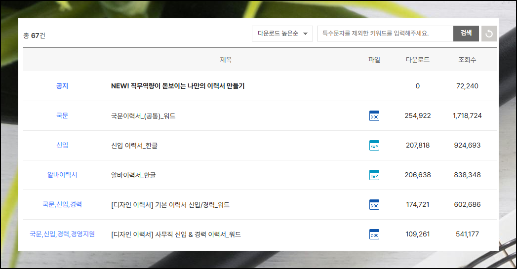 수많은 템플릿 중에서 선택하기 어렵다면 [다운로드 높은 순]으로 분류해보세요. 이렇게 하면 다수의 사람들이 선호한 인기 양식을 우선적으로 확인할 수 있어요. 경험자들의 선정을 참고하면 더 적절한 기본 서식을 고를 수 있답니다.