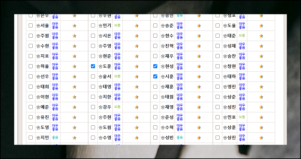 각 항목마다 등급과 선호도가 표시되어 있습니다. 등급이 높을수록 성명학적으로 좋은 선택이라고 볼 수 있어요. 선호도는 많은 사람들이 사용하는 인기 있는 호칭을 의미하는데, 이는 참고용으로만 활용하는 것이 좋습니다. 너무 흔한 것은 특별함이 줄어들 수 있으니까요. 마음에 드는 여자 한글 이름 3개를 골라 "사주에 맞는 추천한자 보기" 버튼을 클릭해보세요.