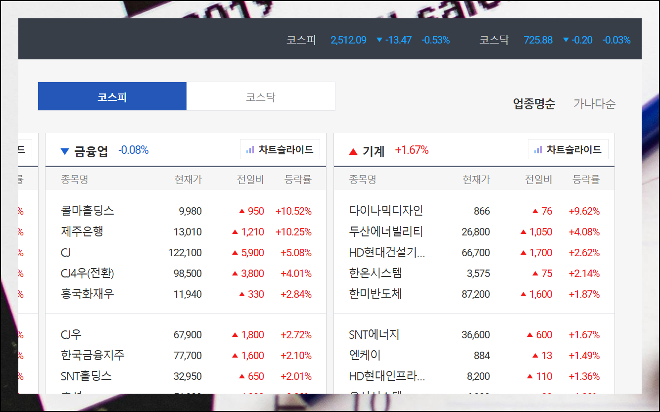 업종명순 정렬 시 나타나는 [차트 슬라이드] 버튼을 사용해보세요. 이 기능으로 같은 업종 내 여러 종목 현황을 순차적으로 살펴볼 수 있습니다. 자동넘김 속도를 조절하면 클릭 없이 편하게 오늘의 주식 현황을 확인할 수 있어요.