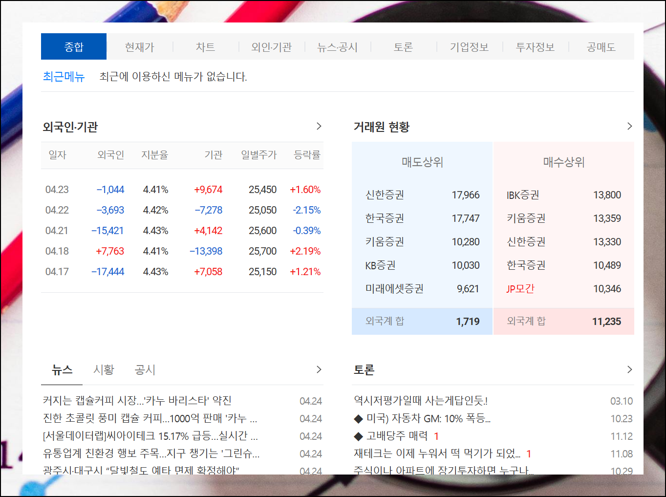 생소한 회사라면 [기업정보] 메뉴를 확인해보세요. 기업개요, 재무분석, 컨센서스, 업종분석, 투자지분 등 심층적인 콘텐츠를 살펴볼 수 있습니다. 핵심만 확인하고 싶다면 [종합] 버튼을 통해 외국인과 기관의 매매 동향, 최신 뉴스와 공시, 투자자 토론 내용을 한눈에 볼 수 있어요.