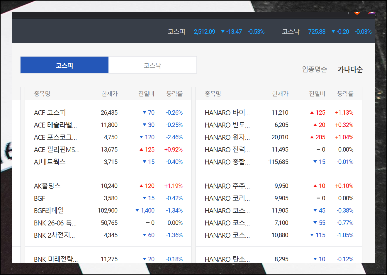 새롭게 열린 페이지에서는 잘 정리된 오늘의 주식시세표를 통해 여러 가지 데이터를 확인할 수 있습니다. 가나다순 분류를 사용하면 원하는 종목의 정보를 빠르게 찾을 수 있어요. 업종명순 배열을 활용하면 동일 업종 종목들이 함께 표시되어 특정 산업군의 전반적인 상황을 쉽게 파악할 수 있답니다.