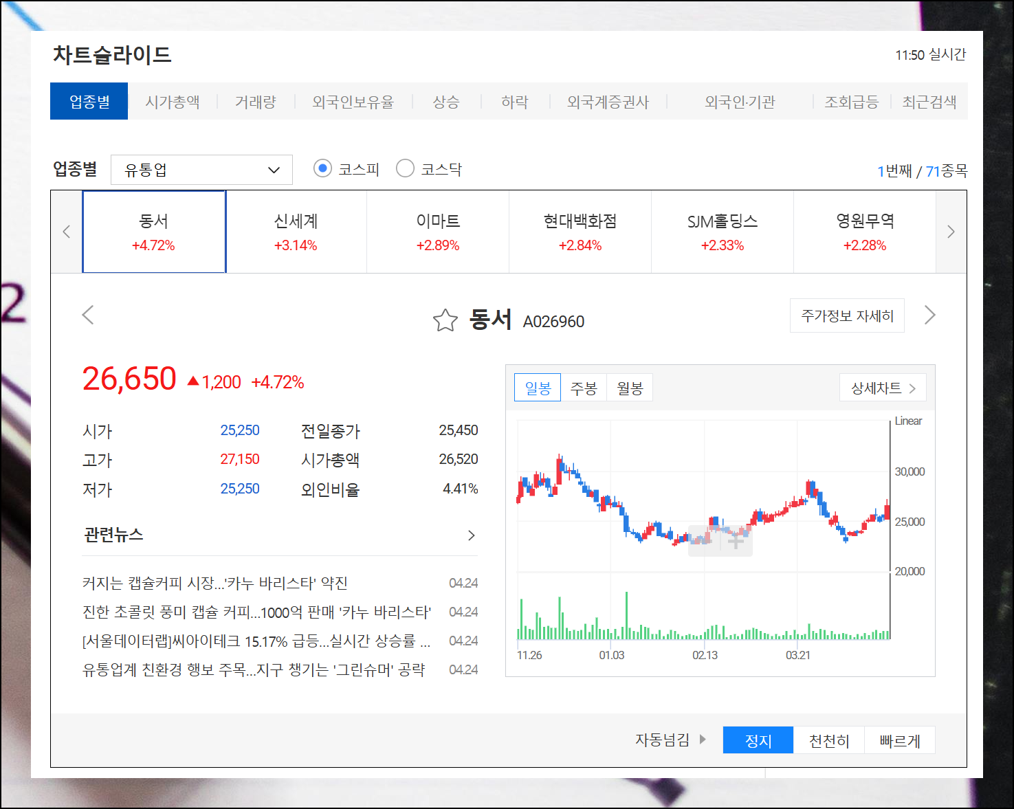 업종명순 정렬 시 나타나는 [차트 슬라이드] 버튼을 사용해보세요. 이 기능으로 같은 업종 내 여러 종목 현황을 순차적으로 살펴볼 수 있습니다. 자동넘김 속도를 조절하면 클릭 없이 편하게 오늘의 주식 현황을 확인할 수 있어요.