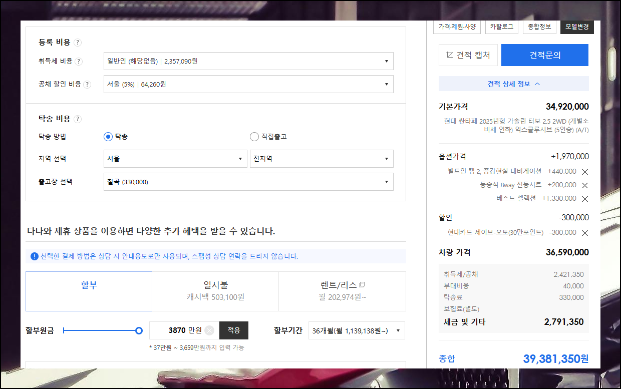 견적 시스템에서는 지역과 출고장 정보만 입력하면 이런 부가 비용까지 자동 계산해줍니다. 모든 단계 완료 후 화면 우측 하단에서 최종 지불 금액을 확인해보세요.