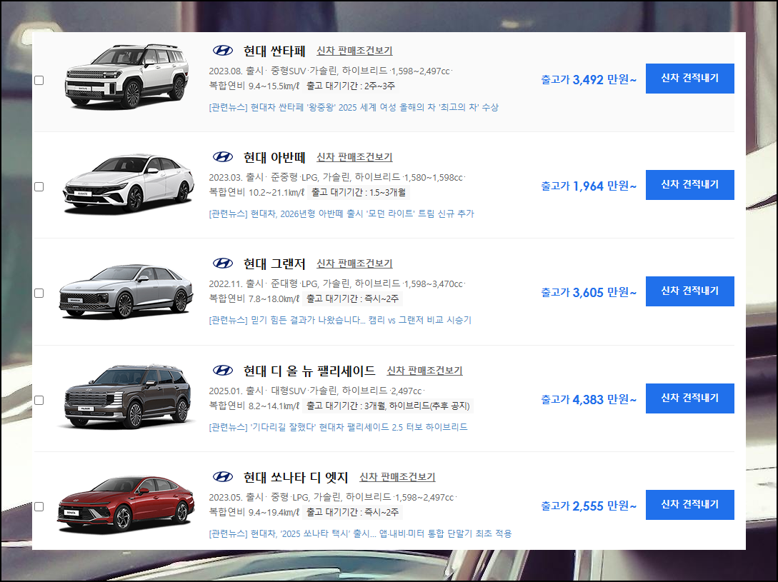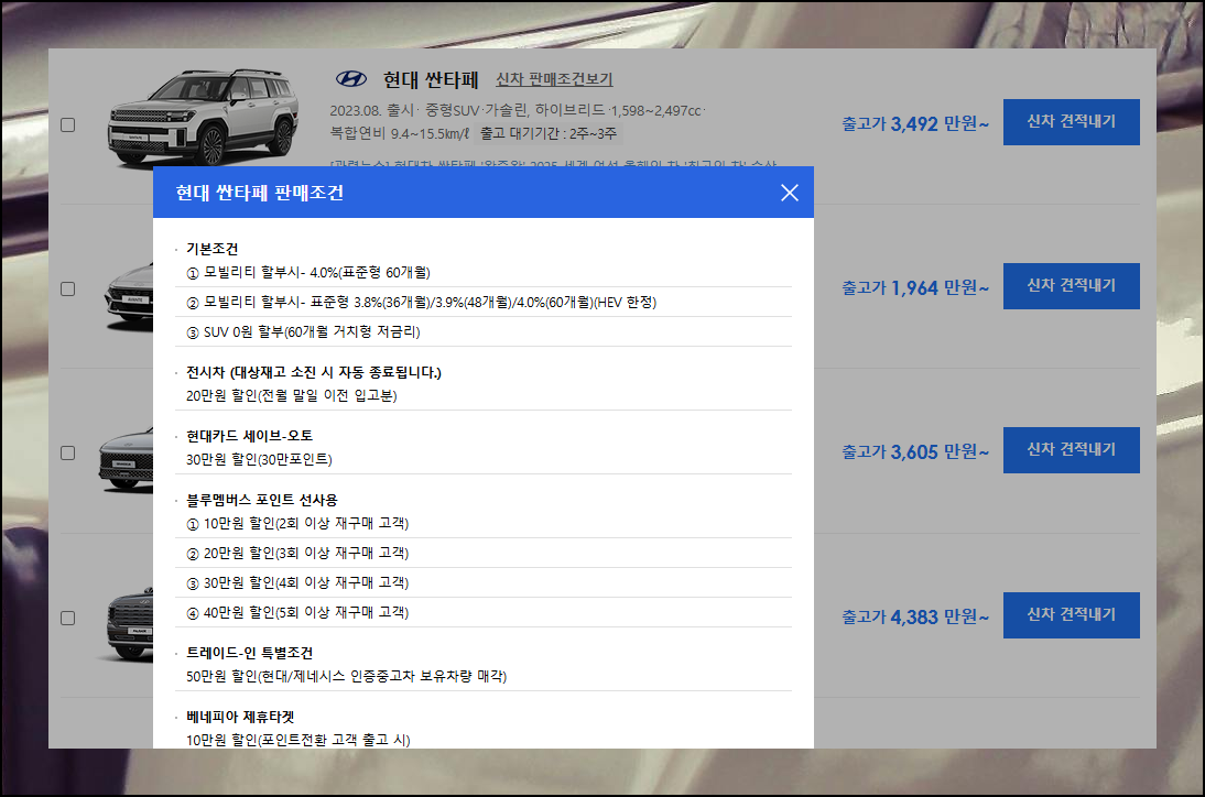 더 자세한 내용을 살펴보기 위해 인기 모델인 싼타페의 [신차 판매조건]을 확인해보도록 하겠습니다.