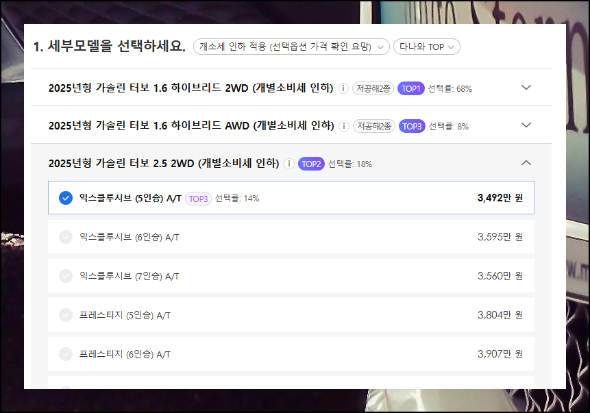 각 단계에서 연료 유형, 구동 방식, 세부 등급 등에 대하여 자신의 차량 운행 스타일을 고려해 선택하면 돼요.