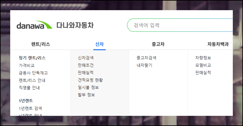 웹사이트 접속 후 상단 메뉴에서 [신차 검색]을 눌러주세요.
