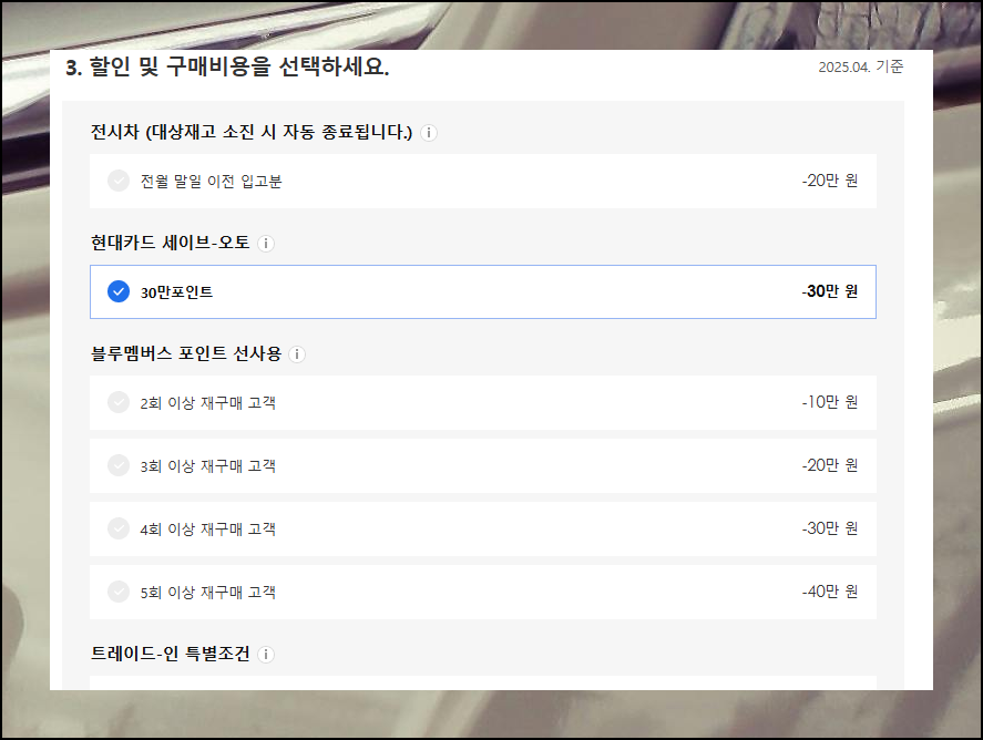 다양한 판매조건 중 본인에게 적용 가능한 항목을 골라보세요. 현대차는 시즌과 차종에 따라 여러 할인 혜택을 제공하니, 꼼꼼히 살펴보면 예상보다 더 많은 혜택을 받을 수 있어요.