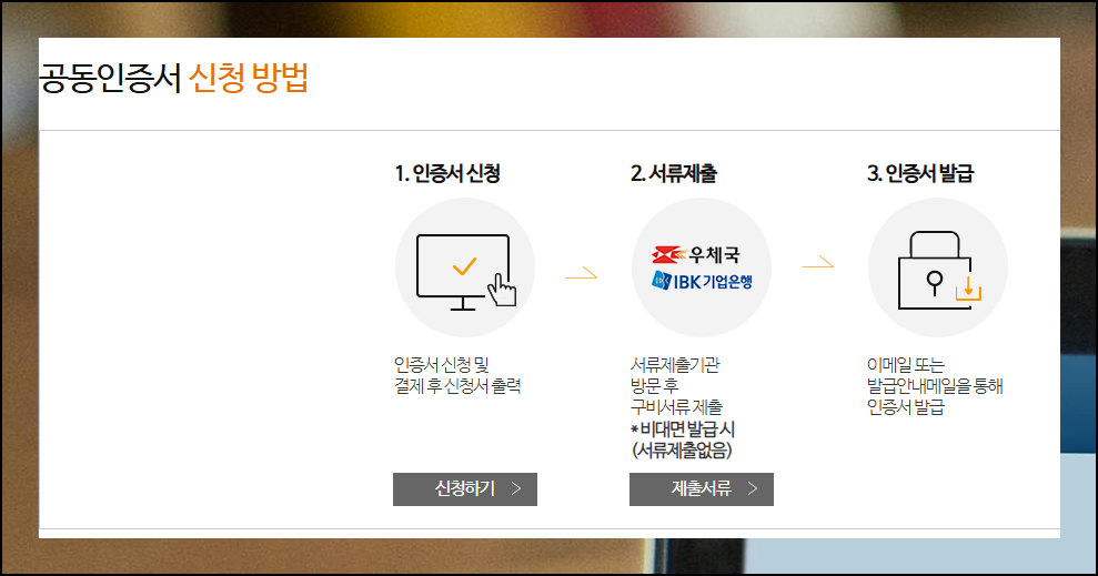 은행용으로 발급을 받고 싶을 때 이용하는 절차예요. 시작하기 전에 주거래 은행을 찾아가 인터넷 뱅킹 서비스를 신청해야 합니다.