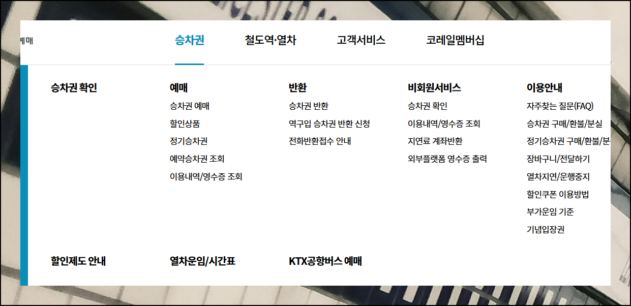 전체 메뉴를 열어보면 "승차권"의 하위 메뉴에 "열차 운임 / 시간표"를 찾을 수 있습니다. 해당 메뉴를 선택해주세요.