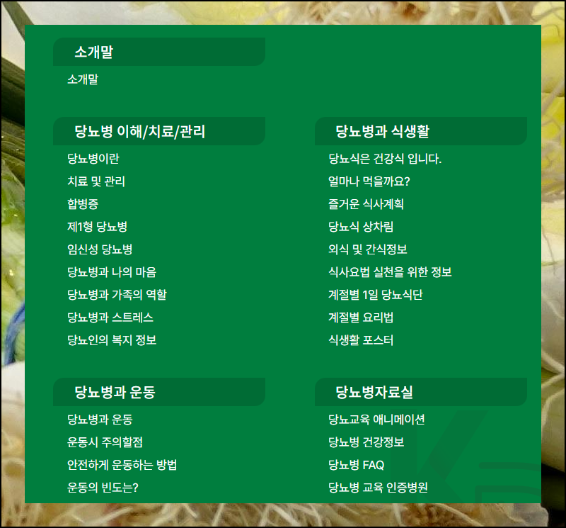 사이트의 여러 카테고리 중 식생활 섹션을 선택하면 계절별 건강 식단표를 확인할 수 있습니다.