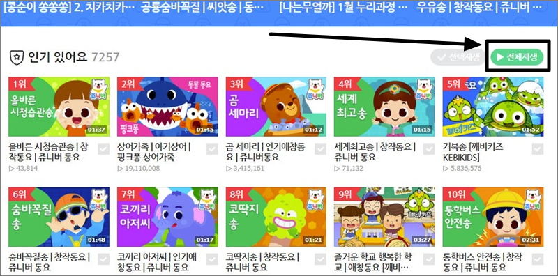 ▼ 저는 인기동요를 선택했습니다. 7,257개의 곡을 무료로 듣기 가능합니다. 전체 곡에 대하여 무료듣기연속재생을 하고 싶다면 리스트 상단 우측에 있는 "전체재생"을 클릭하면 됩니다.