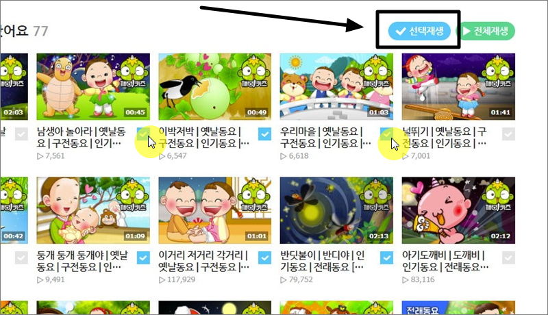 ▼ 유아에게 맞는 동요만 선택해서 해당하는 것만 듣기 원한다면 선택재생 기능을 이용하면 됩니다. 우리나라 전래동요인 남생아 놀아라, 이박저박, 우리마음, 둥개 둥개 둥개야, 이거리 저거리 각거기, 반딧불이 등을 선택한 후 "선택재생" 버튼을 클릭해 보았습니다.