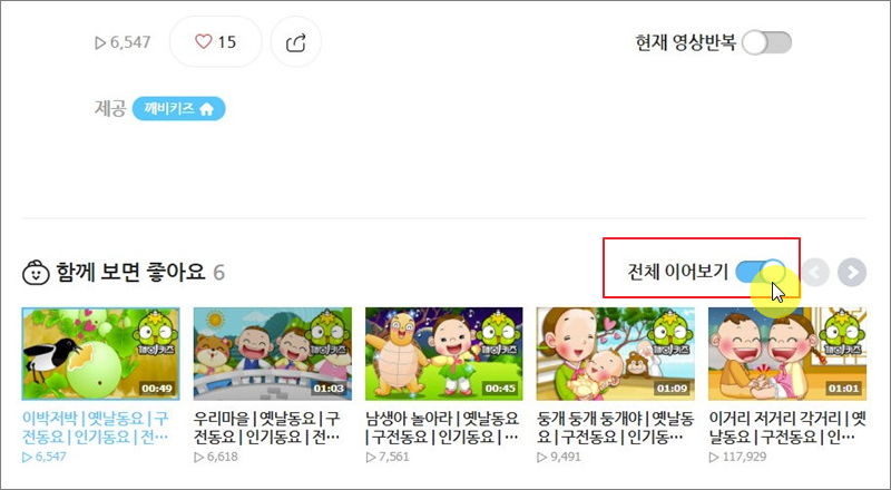 ▼ 함께 보면 좋은 유아동요를 연속으로 재생하고자 한다면 "함께 보면 좋아요" 카테고리 옆에 있는 "전체 이어보기"를 체크하면 됩니다. 이런 식으로 유아에게 좋은 동요를 무료듣기연속재생을 할 수 있습니다. 앞서 언급한 바와 같이 몇 곡만 선택해서 아이에게 들려줄 수 있습니다. 이 방법을 통해 아이가 좋아하는 곡 위주로 들려주시길 바랍니다.