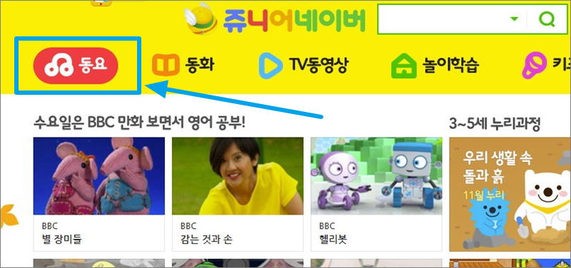 ▼ 쥬니어네이버 사이트를 통해 유아동요 듣기를 해보도록 하겠습니다. 참고로 여기에서 제공하는 컨텐츠는 대부분 무료입니다. 그럼 메뉴에서 "동요"를 클릭한 후 무료듣기연속재생을 해보도록 하겠습니다.