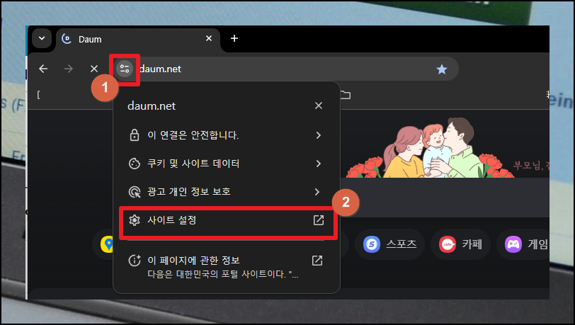 크롬 브라우저 우측 상단의 메뉴 아이콘(전세계 버튼)을 클릭하고 환경설정으로 들어가세요. 왼쪽 메뉴에서 '개인 정보 보호 및 보안'을 찾은 다음 [사이트 설정]을 선택하면 됩니다.
