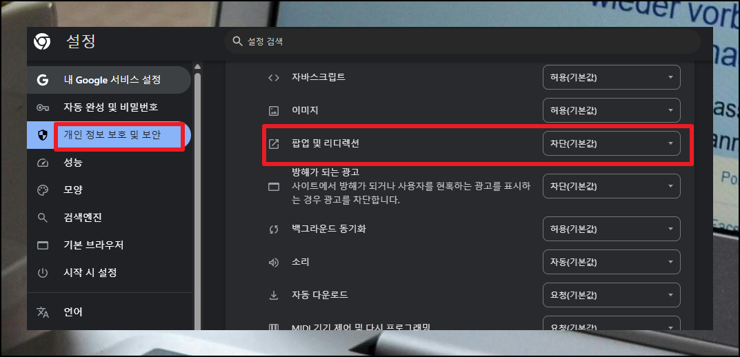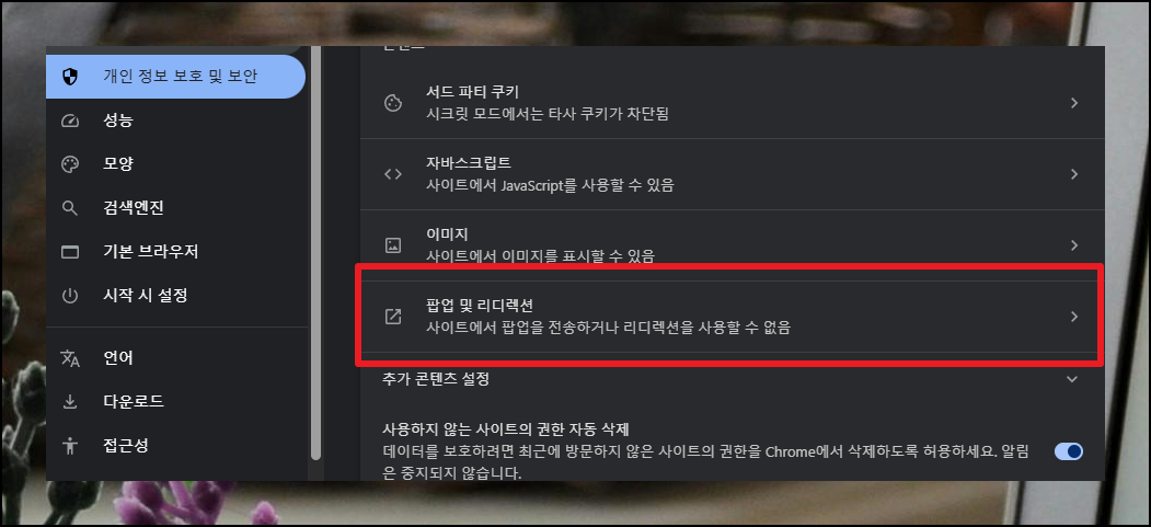 콘텐츠 카테고리에서 "팝업 및 리디렉션" 항목을 찾아 선택하세요. 대부분의 컴퓨터는 기본적으로 팝업이 제한된 상태로 구성되어 있어요.