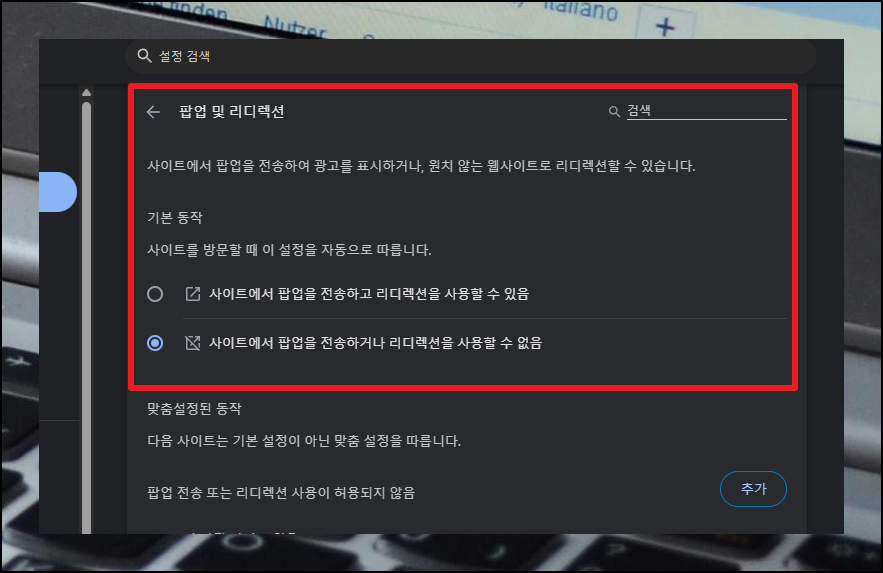 기본 동작 섹션에서 팝업차단 해제 여부를 지정할 수 있어요. 첫 번째 옵션은 모든 것을 허용하고, 두 번째 옵션은 새 창을 제한합니다.