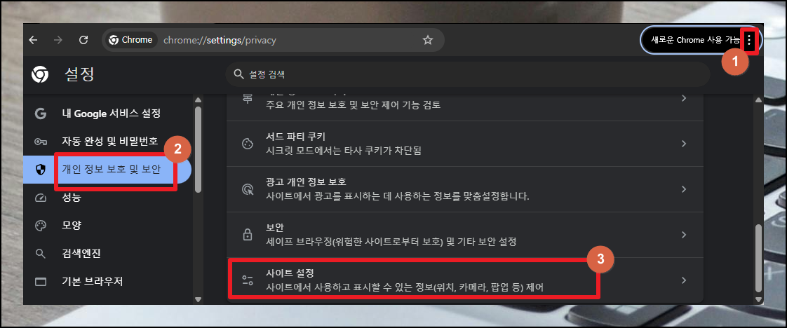 크롬 브라우저 우측 상단의 메뉴 아이콘(전세계 버튼)을 클릭하고 환경설정으로 들어가세요. 왼쪽 메뉴에서 '개인 정보 보호 및 보안'을 찾은 다음 [사이트 설정]을 선택하면 됩니다.