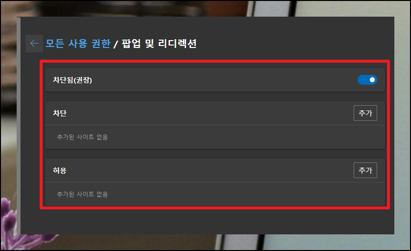 엣지 브라우저의 팝업 설정 화면에서 모든 사이트에 대한 기본 구성을 조정하거나, 특정 페이지만 예외로 지정할 수 있어요.