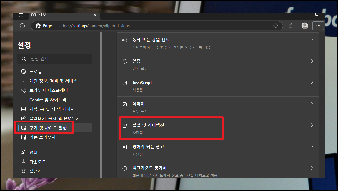 엣지 브라우저에서도 유사한 방식으로 설정 진행 및 변경할 수 있어요. 우측 상단 점 3개 메뉴를 누른 후 환경설정으로 이동하세요. 그다음 "쿠키 및 사이트 권한"에서 "팝업 및 리디렉션" 항목을 확인하면 됩니다.