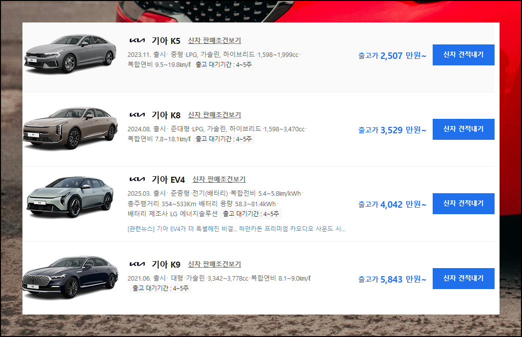 인기 모델인 기아차의 K8를 살펴볼게요. 모델 목록에 나온 출고가를 보면 최소 금액인 3,529만원이 표시되어 있습니다.