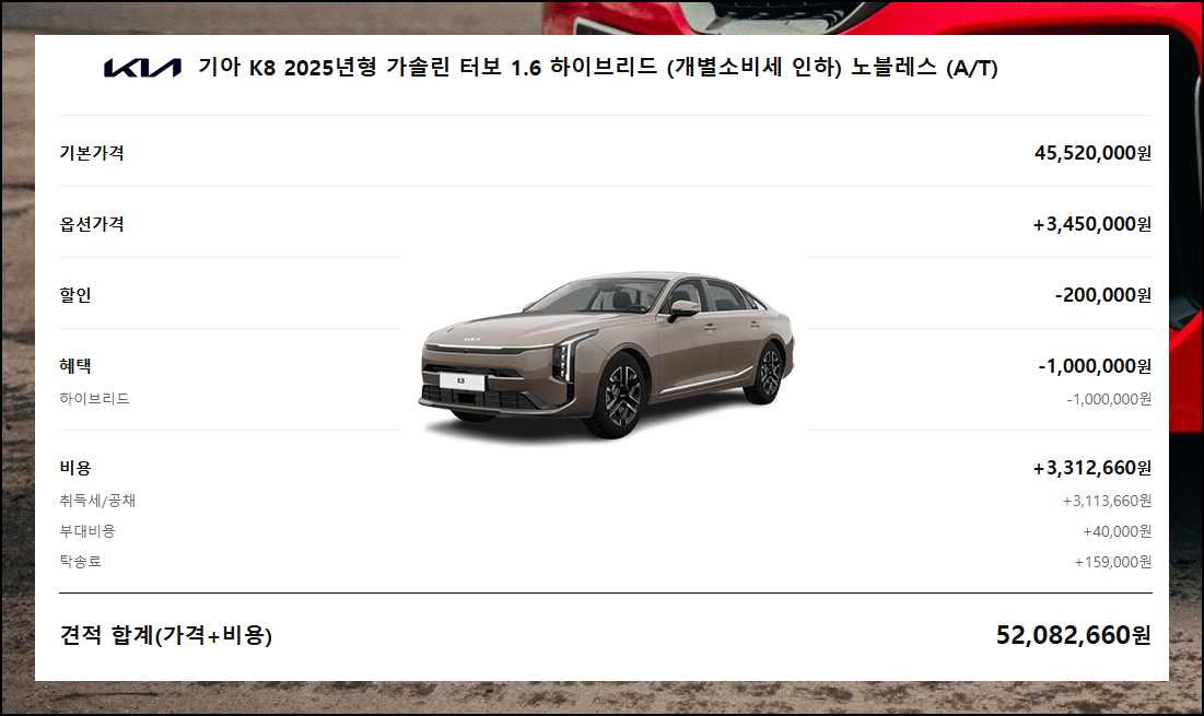 기아차 모델인 K8 2025년형 가솔린 터보 1.6 하이브리드에 대한 최종 가격표를 살펴보았습니다. 제 선호도와 할인 조건이 모두 반영하여 정확한 금액을 알려주는데요.