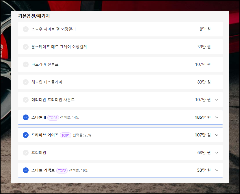 두 번째 단계는 기능과 색상 선택입니다. 요즘 드라이브 와이즈 패키지가 인기 있는데요, 주행 안전성과 편의성을 향상시키기 때문이에요. 기아차 옵션에 대한 금액과 선호도를 참고하여 고르면 됩니다.