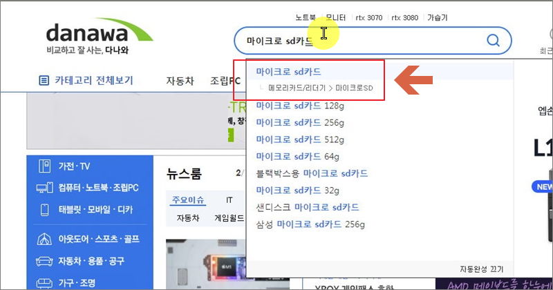 ▼ 다나와 사이트에 접속해서 "마이크로 sd카드"를 검색합니다.