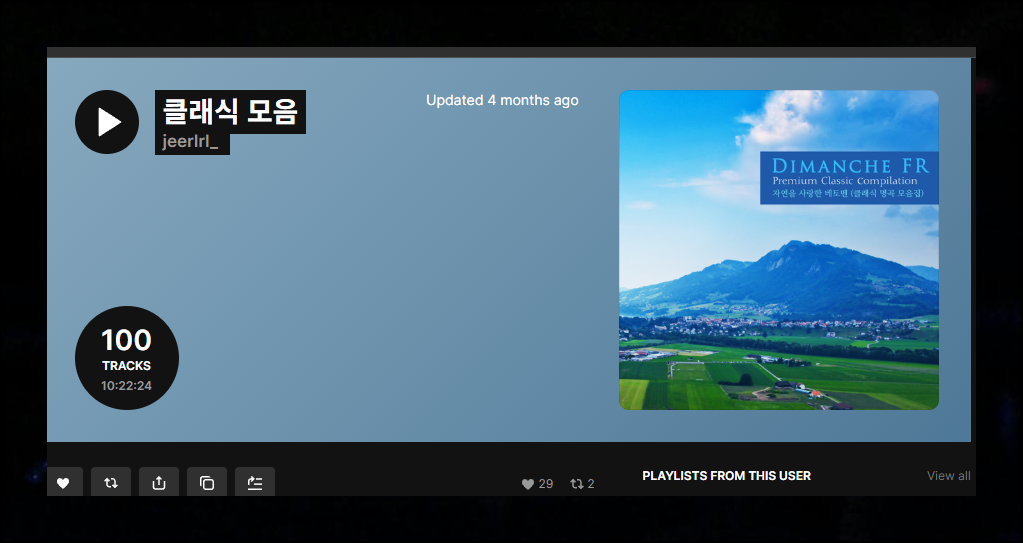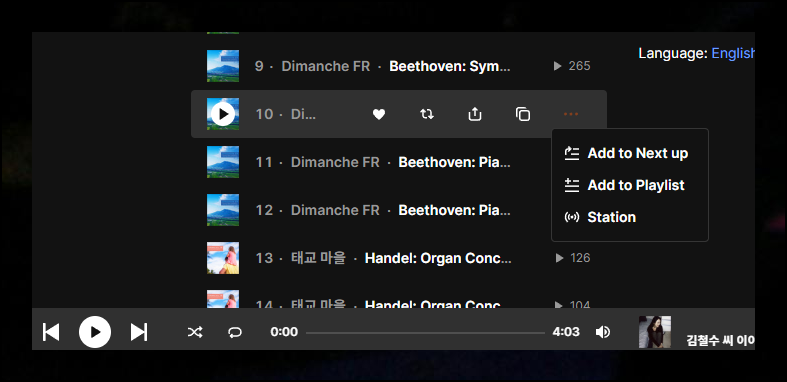 저도 한번 "클래식 모음"으로 검색해봤는데요. 정말 다양한 무료 콘텐츠가 준비되어 있더라고요. 여러 곡을 한데 모은 플레이리스트 기능도 있어서 매우 유용해요. 이 기능을 선택하면 중단 없이 연속으로 음악을 감상할 수 있습니다.