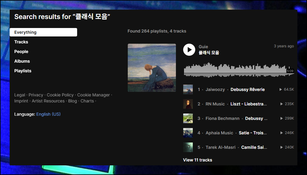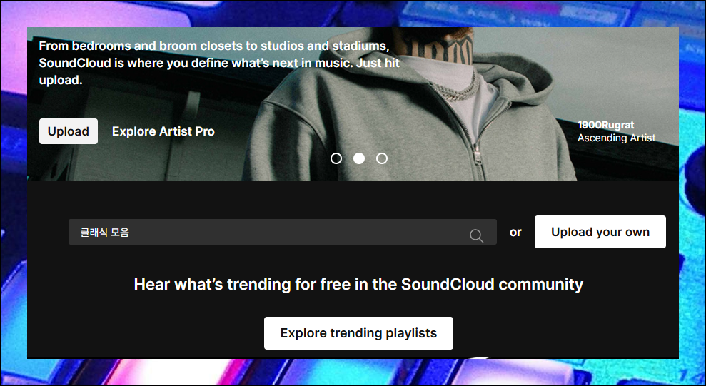 이곳에서는 우리나라 음악뿐만 아니라 다양한 해외 아티스트들의 작품도 만날 수 있어요. 포털 검색창에 사운드클라우드를 치면 공식 홈페이지를 쉽게 찾을 수 있습니다.