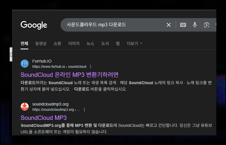 간단한 웹 검색으로 사운드클라우드의 트랙을 mp3 형태로 변환해주는 사이트를 찾을 수 있어요. 이러한 사이트에서는 대개 무료로 서비스를 제공하니까 안심하고 이용하세요. "사운드클라우드"에서 원하는 음악을 찾아 URL을 확보하고, 음악 다운로드 사이트에 해당 URL을 입력하면 됩니다.