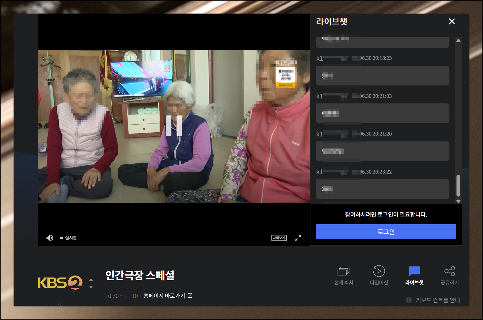 새로 열린 페이지를 보면 동영상 플레이어 화면을 만날 수 있어요. 화면 중앙의 재생 버튼을 누르면 바로 시청이 시작됩니다. 조용한 곳에서 보고 있다면 자막 기능도 이용해보세요. 채팅창 기능도 정말 유용한데요. 방송 프로그램을 시청하는 다른 사람들과 실시간으로 대화를 나눌 수 있어요.